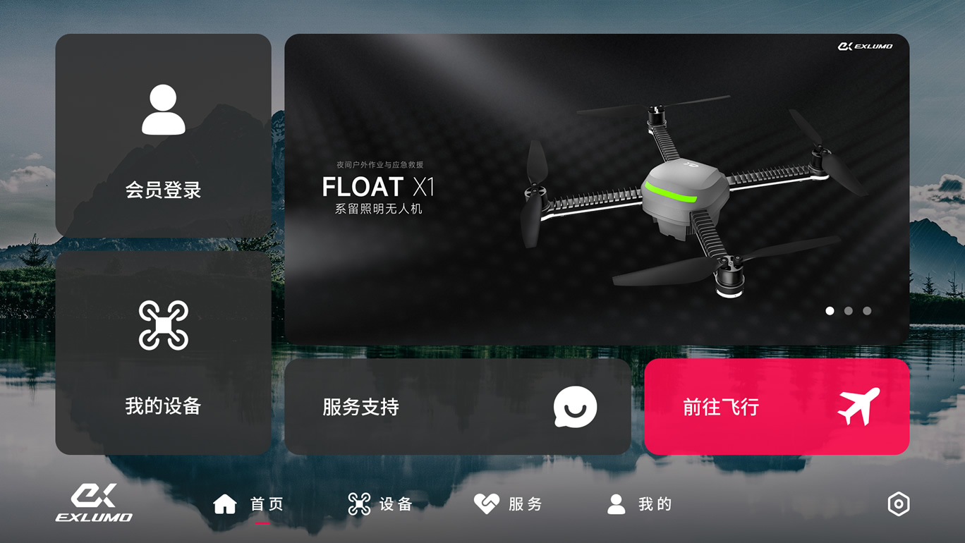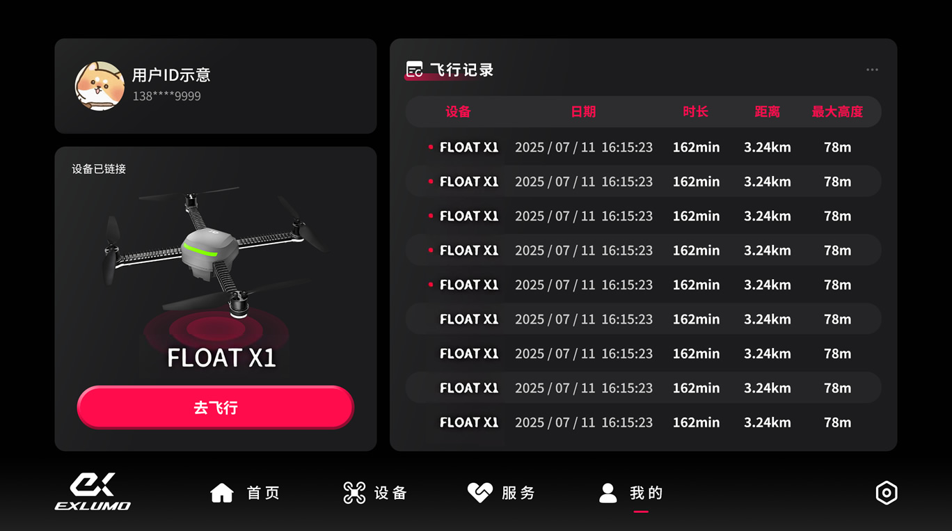 『EXI FLY』APP的每一个界面设计都围绕着如何让用户在黑夜中紧张的工作环境下,也能轻松、准确、可靠地指挥『FLOAT X1』完成任务。稳定与易用,是我们的第一原则。”